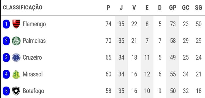 Τρεις αγωνιστικές πριν το φινάλε η Φλαμένγκο βρίσκεται στην κορυφή με ένα προβάδισμα τεσσάρων βαθμών. Παρά το σημαντικό αυτό προβάδισμα που απέκτησε τις τελευταίες μέρες, δεν σημαίνει ότι έχει κλειδώσει τον τίτλο. Δεν έχει περάσει άλλωστε αρκετός καιρός από τη μέρα που η Παλμέιρας βρισκόταν μπροστά. Σε ένα περίεργο παιχνίδι «μήπως θέλετε να ανέβετε εσείς στην κορυφή;», «Όχι, σας παρακαλώ, πηγαίνετε εσείς» οι δυο ομάδες έμοιαζαν για μερικές αγωνιστικές σαν να προσπαθούν να χαρίσουν τον τίτλο η μια στην άλλη. Μόνο τον τελευταίο μήνα η Φλαμένγκο έχει γκελάρει τρεις φορές, με πιο ακραίο παράδειγμα την ήττα από τη Φορταλέζα που παλεύει για τη σωτηρία και πιο πρόσφατο την ήττα από τη Φλουμινένσε στο μεγάλο ντέρμπι του Μαρακανά. Τις προηγούμενες μέρες αρκετοί οπαδοί εξέφραζαν την ανησυχία και τη γκρίνια τους για την απόδοση της ομάδας.
